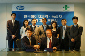 ÇãÀϼ· ³ì½ÊÀÚ ºÎȸÀå(¾ÕÁÙ ¿ÞÂÊ)°ú ¾Æ¸ä ±¬¼± Çѱ¹ÈÀÌÀÚÁ¦¾à »çÀå(¾ÕÁÙ ¿À¸¥ÂÊ)ÀÌ ¾ç»ç °ü°èÀÚµéÀÌ Âü¼®ÇÑ °¡¿îµ¥ ÈÀÌÀÚ°¡ ¼¼°è ÃÖÃÊ·Î °³¹ßÇÑ ¼ºÀåÈ£¸£¸ó ¡®Áö³ëÆ®·ÎÇÉ(Genotropin)¡¯¿¡ ´ëÇÑ Àü·«Àû Á¦ÈÞ Á¶ÀνÄÀ» °®°í ±â³ä ÃÔ¿µÀ» Çß´Ù.