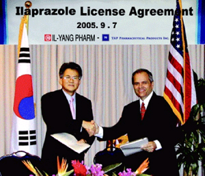 'Ilaprazole'ÀÇ Àü¼¼°è ÆÇ¸Å±ÇÀÇ ¶óÀ̼¾½Ì °è¾àÀ» ü°áÇÑ ¹Ì±¹ÀÇ TAP»ç´Â Çױ˾çÁ¦ °³¹ß ¹× ÆÇ¸ÅÀü¹® Á¦¾à ±â¾÷À¸·Î¼ À۳⠼¼°èTOP 10ÀǾàǰ Áß Çױ˾çÁ¦ ¡®ÇÁ·¹¹Ù½Ãµå¡¯ÀÇ ÆÇ¸Å·Î ¼¼°è ·©Å· 9À§¿¡ ¸¶Å©µÈ ¹Ù ÀÖ°í, 2004³â ¹Ì±¹³» TOP 10 ÀǾàǰ Áß ¡®ÇÁ·¹¹Ù½Ãµå¡¯ ´ÜÀÏǰ¸ñÀ¸·Î ¿¬°£ ¸ÅÃâ 4Á¶¿øÀ» »óȸÇÏ¿© ·©Å· 3À§¿¡ ¸¶Å©°¡ µÈ °Å´ë ±â¾÷ÀÌ´Ù.