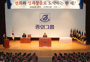 Áß¿ÜÁ¦¾à(´ëÇ¥ À̰æÇÏ)Àº Áö³ 2ÀÏ ¼¿ï¿©¼ºÇöóÀÚ(µ¿ÀÛ±¸ ´ë¹æµ¿ ¼ÒÀç)¿¡¼ ÀÌÁ¾È£ ȸÀå°ú À̰æÇÏ »çÀåÀ» ºñ·ÔÇØ Áß¿ÜÁ¦¾à ¹× °ü°è»ç °úÀåÀÌ»ó ÀÓÁ÷¿øÀÌ Âü¼®ÇÑ °¡¿îµ¥ ½Ã¹«½ÄÀ» °ÅÇàÇϰí, 2006³â °æ¿µ¹æÄ§À¸·Î "ºñÀü ½ÇÇöÀ» À§ÇÑ '¼º°ú ÀÖ´Â ºü¸¥ Çൿ, µµÀü ¸ñÇ¥ ´Þ¼º'"À» »õ·Ó°Ô ¼³Á¤Çß´Ù.
