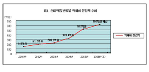 ¿¬µµº°·Î ÃßÀ̸¦ º¸¸é 2001³â 147¾ï¿ø¿¡ ºÒ°úÇÏ´ø ¾àÁ¦ºñ °æ°¨¾×Àº 2002³â171.2¾ï¿ø,2003³â 209.5¾ï¿ø,2004³â 328.4¾ï¿ø,2005³â¿¡´Â 512¾ï¿øÀ¸·Î °è¼Ó Áõ°¡Çß´Ù. 2005³âÀº 2001³â¿¡ ºñÇØ¼ ¹«·Á 247.2%³ª ±ÞÁõÇß´Ù.