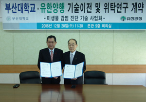 ºÎ»ê´ëÇб³(ÃÑÀå ±èÀμ¼)¿Í ¢ßÀ¯ÇѾçÇà(´ëÇ¥ÀÌ»ç Â÷Áß±Ù)Àº 12¿ù 20ÀÏ ¿ÀÀü ºÎ»ê´ëÇб³¿¡¼ ¹Ì»ý¹° °¨¿° Áø´Ü ±â¼úÀÇ »ó¾÷ȸ¦ À§ÇÑ ±â¼úÀÌÀü ¹× °øµ¿¿¬±¸ °è¾àÀ» ü°áÇϰí, º»°ÝÀûÀÎ ¿¬±¸Çù·Â½Ã½ºÅÛÀ» °¡µ¿Çϱâ·Î Çß´Ù.