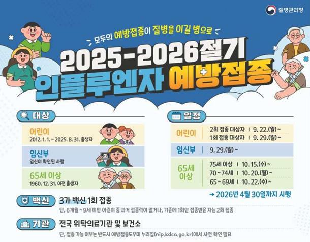Áúº´°ü¸®Ã»Àº Áö³ 9¿ù 22ÀϺÎÅÍ 2025-2026Àý±â ÀÎÇ÷翣ÀÚ ±¹°¡¿¹¹æÁ¢Á¾À» 6°³¿ù~13¼¼(2012.1.1.~2025.8.31. Ãâ»ýÀÚ) ¾î¸°ÀÌ, ÀӽźÎ, 65¼¼ ÀÌ»ó (1960.12.31. ÀÌÀü Ãâ»ýÀÚ) ¾î¸£½Å ´ë»óÀ¸·Î ½ÃÇàÇϰí ÀÖ´Ù. 11¿ù 18ÀÏ ±âÁØ, ÃÑ 1,108¸¸¸íÀÌ Á¢Á¾ÇÏ¿´À¸¸ç, Áö³ 2024-2025Àý±â µ¿±â°£°ú ºñ±³ÇÏ¿© ¾î¸£½Å°ú ¾î¸°ÀÌ ¸ðµÎ ³ôÀº Á¢Á¾·üÀ» º¸À̰í ÀÖ´Ù.
