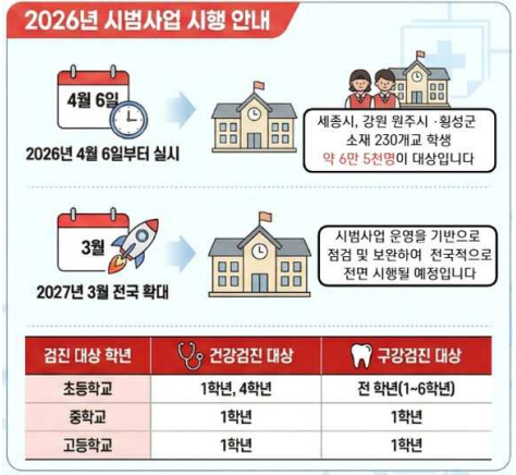 ÃʵîÇб³ 1¡¤4Çгâ, ÁßÇб³ 1Çгâ, °íµîÇб³ 1ÇгâÀÌ ´ë»óÀ̸ç, ±¸°°ËÁøÀº ÃʵîÇб³ Àü Çгâ, ÁßÇб³ 1Çгâ, °íµîÇб³ 1ÇгâÀÌ ´ë»óÀÌ´Ù. ´ë»óÀÚµéÀº ½Ã¹üÁö¿ª ³» °ËÁø±â°ü¿¡ ÀÚÀ¯·Ó°Ô ¹æ¹®ÇÏ¿© °ËÁøÀ» ¹ÞÀ» ¼ö ÀÖ´Ù.