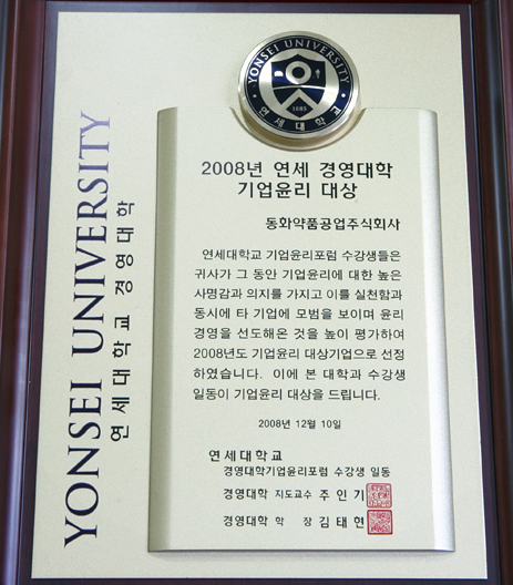 µ¿È¾àǰÀº Áö³ 12¿ù 10ÀÏ ¿¬¼¼´ëÇб³ °æ¿µ´ëÇп¡¼ ¡®2008³â ¿¬¼¼ °æ¿µ´ëÇÐ ±â¾÷À±¸® ´ë»ó¡¯À» ¼ö»óÇÏ¿´´Ù.