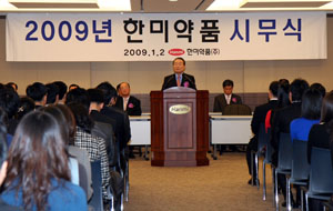Çѹ̾àǰ ÀÓ¼º±â ´ëÇ¥ÀÌ»ç ȸÀåÀº Áö³ 2ÀÏ Çѹ̾àǰ º»»ç 2Ãþ ÆÄũȦ¿¡¼ 2009³â ½Ã¹«½ÄÀ» °®°í "±âº»°ú ¿øÄ¢À» ÁöŰ´Â Çѹ̾àǰ¸¸ÀÇ °æ¿µ¸ðµ¨À» ÀçÁ¤¸³ÇØ À§±â¸¦ ±âȸ·Î ¹Ù²ÙÀÚ"°í ¹àÇû´Ù.
