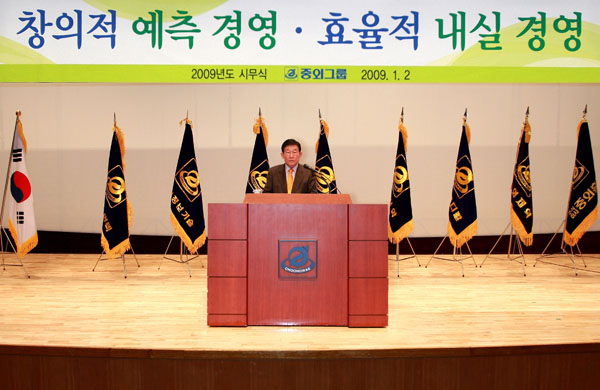 Áß¿ÜȦµù½º´Â 2ÀÏ ´ë¹æµ¿ ¼¿ï¿©¼ºÇöóÀÚ¿¡¼ ÀÌÁ¾È£ ȸÀå, À̰æÇÏ »çÀåÀ» ºñ·ÔÇØ ÆÀÀåÀÌ»ó ÀÓÁ÷¿ø 300¿©¸íÀÌ Âü¼®ÇÑ °¡¿îµ¥ ½Å³â ½Ã¹«½ÄÀ» °®°í ¡°Ã¢ÀÇÀû ¿¹Ãø°æ¿µ, È¿À²Àû ³»½Ç°æ¿µ¡±À» 2009³âµµ °æ¿µ¹æÄ§À¸·Î È®Á¤, ¹ßÇ¥Çß´Ù.