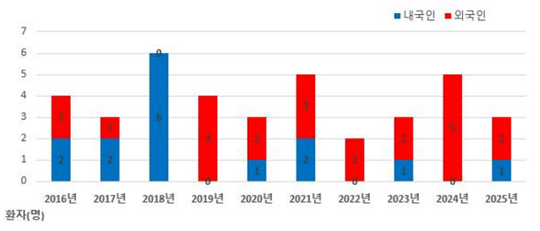 2025³â ±¹³» ÇѼ¾º´ ½ÅȯÀÚ´Â ÃÑ 3¸í(¿Ü±¹ÀÎ 2¸í, ³»±¹ÀÎ 1¸í)À¸·Î 2024³â 5¸í º¸´Ù °¨¼ÒÇÏ¿´À¸¸ç, ¡¯25³â ³»±¹ÀÎ ½ÅȯÀÚ 1¸íÀº ³²ÅÂÆò¾ç Áö¿ª¿¡¼ Àå±â°£ ü·ùÇÑ °ÍÀ¸·Î È®ÀεǾú´Ù.