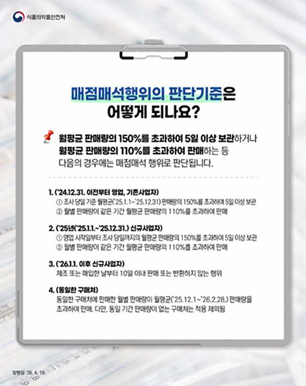 ½Ä¾àó´Â ÇØ´ç ÀڷḦ ¸é¹ÐÈ÷ ºÐ¼®ÇÏ¿©, ÀÔ°í·® ´ëºñ ÆÇ¸Å·®ÀÌ Àû°Å³ª ¸¹Àº Àç°í·®À» À¯ÁöÇϰí Àְųª ÆÇ¸Å °¡°ÝÀ» Áö³ªÄ¡°Ô ³ô°Ô °Ô½ÃÇÏ´Â µî ¸ÅÁ¡¸Å¼®±ÝÁö ÇàÀ§°¡ ÀǽɵǴ ¾÷ü¸¦ ´ë»óÀ¸·Î ´Ü¼ÓÇÒ ¿¹Á¤ÀÌ´Ù.